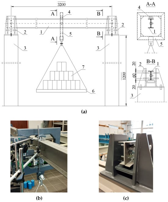 Due to the knowledge gap presented above, this research was aimed at the experimental verification of the following hypotheses: (1) in transversely bending built-up beams, there is an eigenvalue of the elastic critical load, (2) the critical load depends on the longitudinal spacing of the bolted connectors, (3) loading the test model with ballast may allow only the gravity load to be obtained without the disadvantages (in this case, the influence of lateral support), (4) there is a spacing of fasteners that is more significant than in the case of compression members and economically justifiable, which provides an equivalent critical load resistance in relation to a member with an equivalent uniform cross-section.