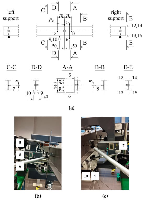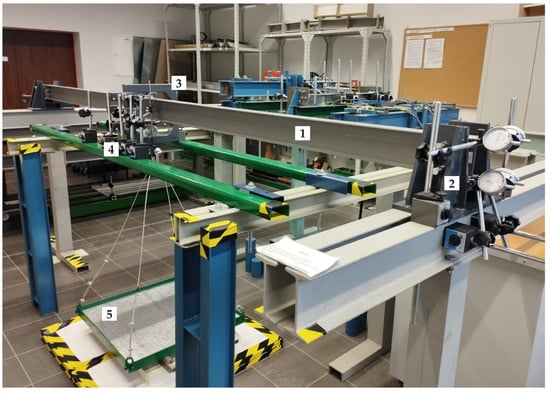 15] present experimental tests and numerical simulations of transversely bent stainless steel two-branch beams. The beam cross-sections have shown sensitivity to local buckling. In the four-point bending test of unbraced beams, the interaction phenomenon of local and lateral-torsional buckling was observed. An original load generation system was used to reduce the effect of actuator heads laterally supporting the model. Unique four-joint frames were used to transfer the load from the actuators in the form of concentrated forces applied to the shear centre of the built-up cross-section. However, in the opinion of the authors of this paper, even such a complex method of loading with actuators does not guarantee that only gravity loading can be achieved without introducing an undesirable—in this case, a lateral elastic support effect on the model. This effect affects the lateral-torsional buckling phenomenon under investigation and depends on the elastic support index in the lateral direction, which is difficult to determine.