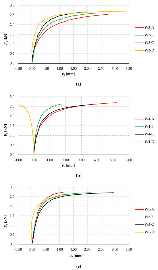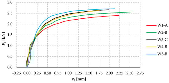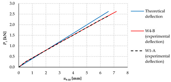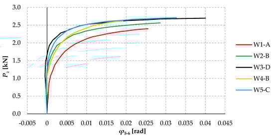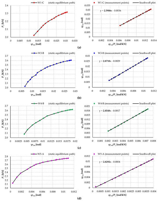 The coefficients of variation of the elastic critical load obtained in the experiments in individual model variants are insignificant (max. 4.7% for W1) and decrease with an increasing number of bolts (min. 1.3% for W5). This demonstrates the high accuracy of the models and the test bench, the correct way of generating the gravity load, the high accuracy of the rotation angle measurements, and the correctness of the modification of Southwell’s method used in the work to determine the Pz,cr.
