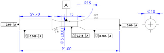 The specimen was prepared according to the drawing presented in Figure 1. The dimensions of the test specimens were decided according to ASTM E606/E606M [18]. The nominal specimen gauge length and the extensometer gauge length were 15 mm and 12.5 mm, respectively. The diameter of the specimen was 5 mm. The surface of the specimen was polished for an Ra of 1.6.