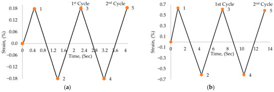 Figure 3 represents the applied strain (%) versus the time (Sec) used to apply it. Figure 3a represents the applied strain of the 0.18% strain amplitude model and Figure 3b represents the applied strain for the 0.6% strain amplitude. For both specimens, the first cycle initiates from the rest position of the specimen (i.e., 0% strain) and proceeds until 1, which is a quarter of one full cycle, followed by the path (1–2) compression part of the cycle and (2–3) tension part of the cycle to complete the first cycle. The second cycle follows the path (3–4–5), and so on.