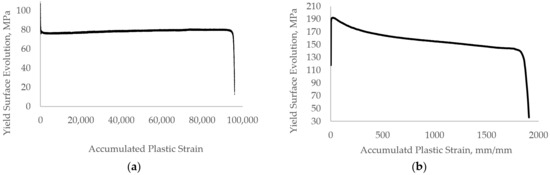 Figure 4 represents the isotropic hardening curve applied to the numerical simulation. The yield surface evolution (σ) versus accumulated plastic strain curve is plotted for the isotropic hardening curve. The curve presented in Figure 4a,b is used to describe the material models of 0.18% strain and 0.6% strain, respectively.