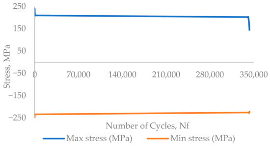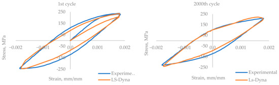 For the comparison of the numerical simulation results and the experimental results, the hysteresis loop was plotted for stress versus strain. The hysteresis loop was plotted for the 1st and 2000th cycles, presented in Figure 7. Upon comparing the hysteresis loops, they showed very close agreement. Slight deviation in the elastic and plastic stress–strain intersection point is observed between the experimental and simulation results. The maximum stress obtained from the model is higher than the experimental value.