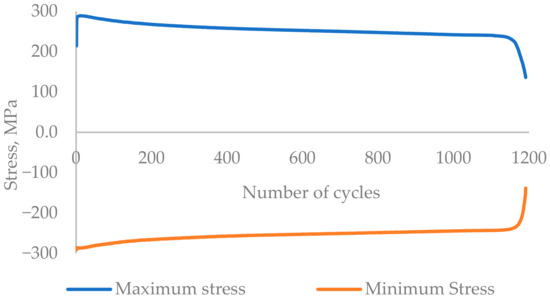 For the numerical simulation of the low-cycle fatigue behaviour of the component subjected to cyclic loading, the cyclic plasticity of the material should be modelled until the results reach stabilisation [20]. The finite element method is a convenient tool for predicting the stress–strain history to estimate the fatigue life of the component as closely as possible to the actual fatigue life of the component [11]. The durability of components that undergo cyclic loading can be estimated if a numerical simulation is performed until it reaches the stabilisation state, with the stabilisation of the material generally being observed at the halfway point of the total number of loading cycles until the failure of the part [11].