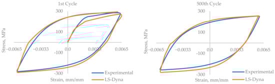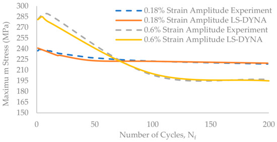 The simulation was performed by employing the explicit solver (default) in Ls-Dyna R13.1.0 software. The results of the numerical simulation were plotted as the stress-versus-strain hysteresis loop in Figure 7, and the maximum stress for the cycle versus the number of cycles in Figure 8, along with the experimental results.