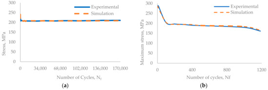 To check the validity of the numerical model prepared by applying isotropic hardening along with kinematic hardening to model the material for the total number of loading cycles up to the failure, the results obtained from the numerical simulation were compared with the experimental results. For the same purpose, a curve was plotted for the maximum stress versus the corresponding number of cycles, which is presented in Figure 9.