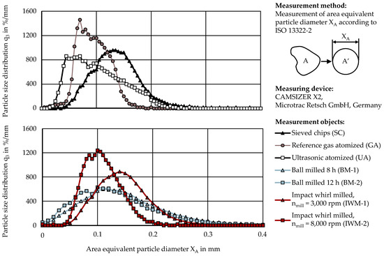 Measurements of PSD and morphology were carried out via dynamic image analysis. In two split plots, Figure 2 shows the PSD with the area-equivalent particle diameter XA for the investigated powders of this study. The PSD of metal powders for powder-based DED processes usually lies in the range of XFmin,10 = 50 µm to XFmin,90 = 150 µm [26], while some commercially available powders also have wider ranges in PSD with XFmin,90 > 200 µm. The gas-atomized reference powder in this study had a PSD of XA,10 = 64 µm to XA,90 = 135 µm.