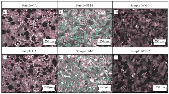 Metallographic cross-sections of the investigated powders can be seen in Figure 4. Expectedly, no inclusions or enclosed areas could be detected for samples BM-1 and BM-2, as these consist of broken chip fractures. Figure 4f shows that in sample IWM-2, the chips were not only crushed during impact whirl milling but also rolled up. As a result, some particles have cavities, which, similar to the pores in atomized powders, may have a negative effect on the density and component quality. Sample UA exhibited almost no gas inclusions, whereas the commercially processed powder GA showed more gas pores.