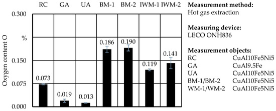 The chemical composition of AM feedstocks plays a crucial role in determining material quality and part properties. The results of the EDX analyses for all base materials are shown in Table 3 together with the standard composition of the base material alloy CC333G as defined in DIN 198 [19]. Besides some minor deviations, all analyzed samples obtained from grinding chips were well within the range of mass fractions defined by the standard. The composition of the gas-atomized material also met the theoretical composition. While EDX analysis is a good tool to qualitatively determine the elements, the technology does not generally allow the gathering of precise compositions [29]. Against this backdrop, the low amount of measured aluminium in sample BM-2 is considered a measurement deviation during EDX analysis. Żrodowski et al. [16] detected a depletion of elements like manganese in certain alloys processed via ultrasonic atomization. However, according to the EDX analysis, manganese content in material UA was the highest, and the chemical composition of material UA did not differ substantially from the other samples. It can be stated that the base material’s chemical composition in all samples was not altered significantly by any of the investigated recycling processes.
