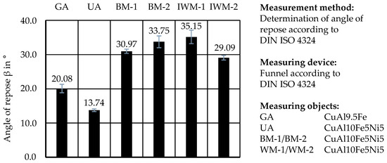 The AOR was determined according to ISO 4324 [25]. For the formation of the powder cone, Vcf = 150 mL of powder was carefully poured through the funnel with a defined orifice of do = 10 mm from the company LPW Technologies, Cheshire, UK. The powder cone builds up on a round plate with a set diameter located under the funnel. The AOR was calculated from the subsequent measurement of the powder cone.