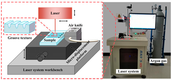 Groove textures were designed on the surface of the polished sample, and a groove-shaped texture was prepared using a Han’s H20 fiber laser marking machine (YLP-H20, laser spot diameter 50 μm, Han’s Laser Technology Industry Group Co., Ltd., Shenzhen, China) under different laser-scanning parameters (Figure 1). In addition, a high-pressure inert gas (99.9998% argon) is used to remove wear debris from the manufactured textured surface in a dry state, and to suppress adverse chemical reactions on the surface during scanning.