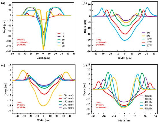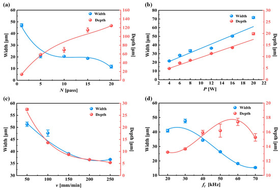 The width and depth of groove texture under different working conditions: (a) change in number of passes (N); (b) change in laser power (P); (c) change in scanning speed (v); and (d) change in pulse frequency (fl).