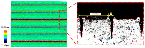 In order to measure the depth and width of the groove on the surface of the workpiece, a three-dimensional confocal interference profilometer was used to photograph the surface of the sample, and the width and depth of each groove on the surface of the sample were measured and recorded. The texture morphology was analyzed and the cross-sectional morphology was plotted by Sensofar analysis software (v 1.9.2).