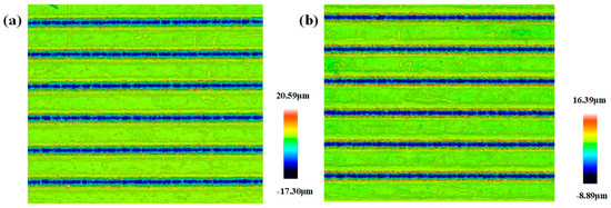 Textured surface topography at different scanning speeds: (a) 100 mm/min; and (b) 200 mm/min.