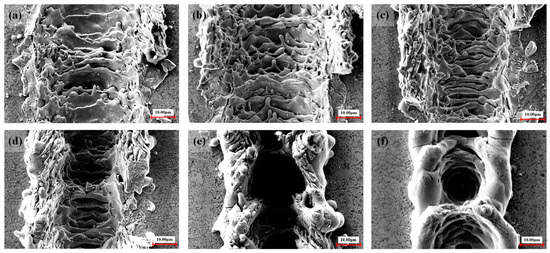 SEM photographs of groove weave morphology at different pulse frequencies: (a) pulse frequency of 20 kHz; (b) pulse frequency of 30 kHz; (c) pulse frequency of 40 kHz; (d) pulse frequency of 50 kHz; (e) pulse frequency of 60 kHz; and (f) pulse frequency of 70 kHz.