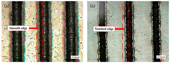 The textured surface morphology was photographed by optical microscope at different pulse frequencies: (a) pulse frequency of 30 kHz; and (b) pulse frequency of 60 kHz.