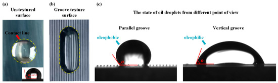 The oil drops on the surface: (a) top view of smooth-surface oil droplets; (b) top view of groove-texture-surface oil droplets; and (c) side view of oil droplets on groove texture surface in two directions.