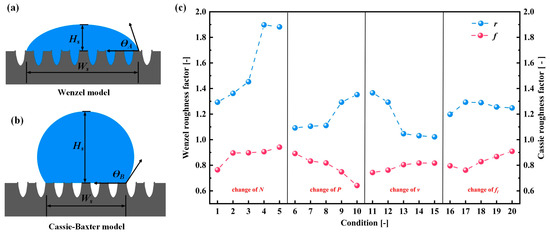 Surface roughness factor measurements: (a) Wenzel model schematic diagram; (b) Cassie–Baxter model schematic diagram; and (c) roughness factor from the Wenzel model and the Cassie–Baxter model.