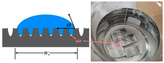 From Figure 10, it is observed that the Wenzel roughness factor is almost consistent with the trend of texture width change, but the roughness factor value of condition 1–5 is similar to that of condition 1–4, which is due to the width and depth of texture not having changed much. From Figure 10a, the initial polished textureless WC/Co cemented carbide surface with Young’s equilibrium contact angle (θY) = 107.9° is essentially symmetrical and exhibits oleophobic behavior. In addition, Figure 12 shows the comparison between the predicted values of the Wenzel contact angle and Cassie–Baxter contact angle parallel to the groove and the actual CA value. It can be seen that the processed surfaces with the groove-shaped texture belong to the oleophobic surface, and the contact angle of the surface is larger than that of the smooth surface, indicating that the oleophobicity increases. These results support the assumption that the surface roughness amplifies the initial wettability of the reference surface. The oil droplets are in the Wenzel state, and the wetting state can be described by the Wenzel model. It can also be clearly observed that, for the groove-textured surface, the equilibrium contact angle increases with the increase in Wenzel surface roughness. In addition, it is observed that the predicted equilibrium contact angle is smaller than the actual equilibrium contact angle, which may be due to the fact that the oil droplets on the groove-textured surface do not completely belong to the Wenzel model. As shown in Figure 13, the sample with oil droplets on the surface is completely immersed in water, and a small number of bubbles is observed at the contact position between the oil droplets and the surface, confirming the above statement. The progress of surface roughness of Cassie–Baxter is the opposite of the trend of texture width, and the predicted contact angle is also smaller than the actual equilibrium contact angle. It also proves that the oil droplets do not completely belong in the Cassie state, and it can be proven that the wetting mechanism of the surface of the textured sample is not only caused by the geometric change of the texture, but is also affected by other factors. Since the samples in this paper are not ultrasonically cleaned after the laser processing of the micro-texture, the continuous burrs formed by the spatter structure of molten particles on the surface of the samples, such as in U. Sudeep’s article [30], have demonstrated that the continuous burrs on the texture surface contribute to its airtight nature, aiding in the enhancement in the SCA. Nevertheless, the formation of burrs will affect the spread of oil droplets on the surface.