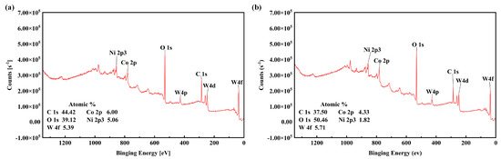 For example, as Fasasi et al. [31] pointed out, the surface chemical composition of the metal substrate can be changed by laser texturing, mainly through material vaporization and chemical reactions with the atmosphere, mainly oxidation. In order to explore the change in chemical composition on the surface of a WC/Co cemented carbide sample and further link the surface chemistry with wettability, the sample was analyzed by X-ray photoelectron spectroscopy (XPS).