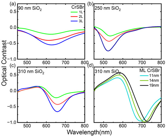 Optical contrast measurements. (a–c) Optical contrast of 1L, 2L, and 3L CrSBr thin flakes on SiO2/Si substrates with SiO2 thicknesses of (a) 90 nm, (b) 250 nm, and (c) 310 nm in the wavelength range 450–800 nm. (d) Optical contrast of 11 nm, 14 nm, and 19 nm CrSBr ML thin flakes on SiO2/Si substrates with SiO2 thicknesses of 310 nm.