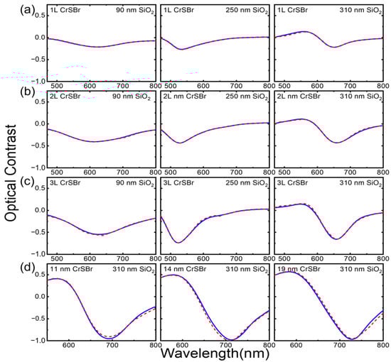 Figure 4 shows the comparison between the experimental data and the fitting results using the procedures in Section 2.3. The relevant parameters used here include the refractive indices of air [32], SiO2 [33], and Si [34]. The thicknesses of the SiO2 layer used here are 90, 250, and 310 nm. The thicknesses of the 1L, 2L, and 3L CrSBr are 0.8, 1.6, and 2.4 nm, respectively, and those used for the ML are 11, 14, and 19 nm. The red lines are the theoretical fitting results, and the blue lines are the experimental data. As is shown in Figure 4, the fitting reasonably agrees with the experiment data.