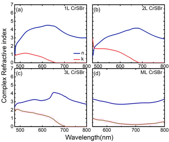 Figure 5 summarizes the extracted complex refractive indices for the 1L, 2L, 3L, and ML CrSBr within the measured wavelengths. The real and imaginary parts of the complex refractive index are represented by the blue and red lines in the figure, respectively. As is known, the real part describes the refraction, and the imaginary part represents the absorption of the materials. While the refractions are qualitatively similar between all samples, the absorptions show distinct behaviors among them. To explain the particular line-shape of the refractive index, it requires first-principle calculation to fully understand its electronic band structure [35]. However, the band gap information is readily available. A typical signature of band gap absorption is a sudden turn-on of absorption in spectra as electrons only absorb photons above band gap energy [13]. In Figure 5, with decreasing wavelengths, the absorptions for the 1L to 3L remain at zero (flat lines) and then abruptly start to increase below certain wavelengths. We can therefore extract the band gap of 1L, 2L, and 3L CrSBr to be around 1.88 eV (659 nm), 1.81 eV (685 nm), and 1.77 eV (700 nm), respectively. The red shift of the band gap is likely due to the quantum confinement effect in the vertical direction [11]. Such an effect is commonly seen in 2D materials in the few-layer limit [36,37,38]. On the contrary, the band gap behavior is not identified in the absorption of the ML sample. Hence, the band gap for the ML sample is beyond our measurement range, suggesting a band gap smaller than 1.55 eV (800 nm). Consequently, we can also deduce the excitonic binding energy for the few-layer samples. From photoluminescence measurements [11], the exciton energy is about 1.2 eV. Therefore, the excitonic binding energies are roughly about 0.6 eV for few-layer samples. As a comparison, the exciton binding energies for single-layer MoS2, WS2, MoSe2, and WSe2 are ~0.54 eV [39], 0.71 eV [40], 0.55 eV [41], and 0.37 eV [42], respectively.