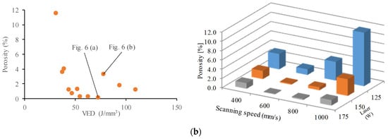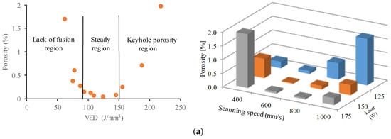 - The optimal process parameters for the lowest porosity were P = 150 W, v = 600 mm/s, and t = 0.02 mm;