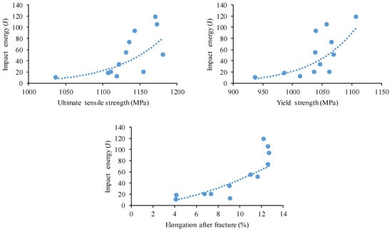 - The maximum absorbed energy value achieved was 119 J. When comparing this result with the highest-impact energy values of as-built LPBF 1.2709 specimens available in the literature, an improvement of more than 20% was achieved;