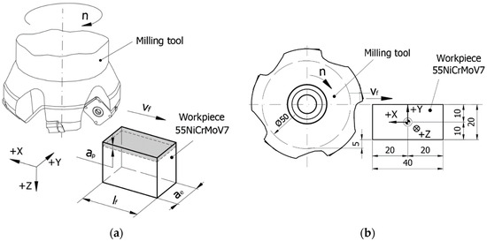 The scheme of the face milling process is presented in Figure 2a. The rotation axis of the tool is positioned in the plane of penetration of the tool teeth into the semi-finished product. The dimensions of the semi-finished product, Figure 2b, were established as follows: the length of the machined surface lf = 40 mm to ensure milling in the stability zone of the process, and the cutting width ae = 20 mm to allow the study of the evolution of the cutting forces and temperatures during the formation of a chip, avoiding the possibility of having two tool teeth in the chip simultaneously, but also being 40% of the active diameter of the tool. These dimensions were the same for all experiments.