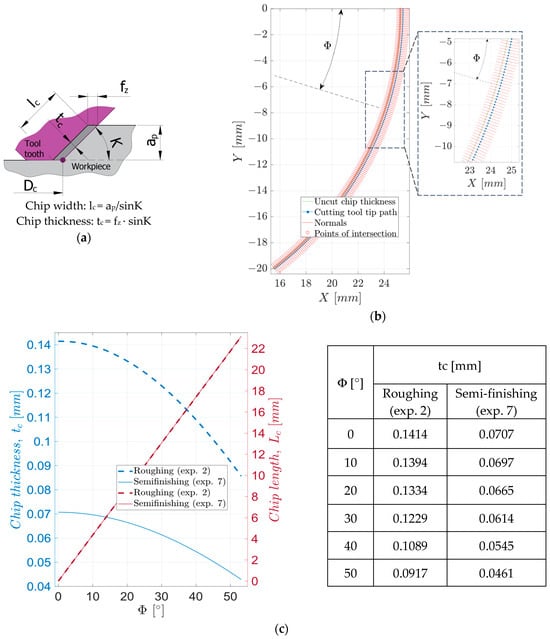 The variation of the uncut chip thickness depending on the angle Φ and the length of the chip, as shown in Figure 5c, was determined numerically as the distance between the two trajectories in the normal direction to the trajectory of the first tooth of the tool. The evolutions of the uncut chip thickness are similar for the two processes: there is a slight decrease in thickness at the beginning of chip formation (for angles Φ below 10°), followed by an increasingly pronounced decrease.