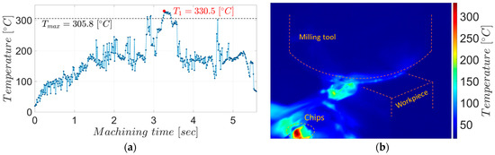 The maximum temperatures in the chips during roughing milling: (a) the evolution of temperatures in the chips for the entire experiment; (b) the thermographic image associated with point T1.