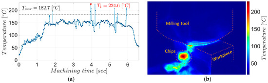 The maximum temperatures in the chips during semi-finishing milling: (a) the evolution of temperatures in the chips for the entire experiment; (b) the thermographic image associated with point T1.