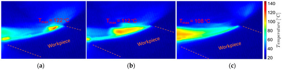Thermographic images from the milling process near the tool-semi-finished contact area, roughing: (a) the beginning of the process—chip formation; (b) middle of the process; (c) the end of the process—chip detachment.