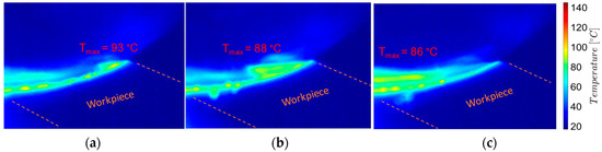 Thermographic images from the milling process near the tool-semi-finished contact area, semi-finishing: (a) the beginning of the process—chip formation; (b) middle of the process; (c) the end of the process—chip detachment.