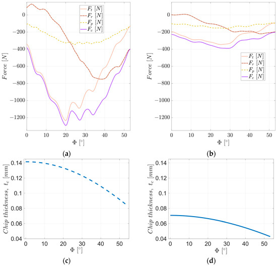 The evolution of the cutting force components in the tool machining system: (a) roughing; (b) semi-finishing; and chip thickness evolution for (c) roughing and (d) semi-finishing.