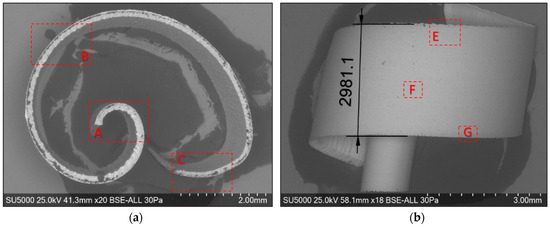 The optical micrograph analysis of the detached chips reveals the following: (i) the detached chips have a spiral shape; (ii) the thicknesses of the detached chips are variable, decreasing along them from the beginning (area A) to the end (area B); (iii) the macroscopic dimensions of the chips in the two experiments are very different. It is found that the chip resulting from roughing, as shown in Figure 6a, has a greater thickness, a greater diameter, and a lower height compared to the semi-finished one, as shown in Figure 6b. Therefore, for the dimensional characterization of chips on a macroscopic scale, two-dimensional parameters of the detached chip are defined: the maximum height hc and the maximum curling diameter dc, which depend on the intensity of the cutting parameters.