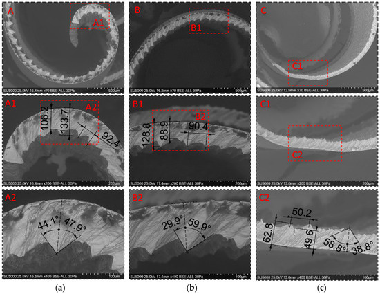 Analysis of the morphology of the generated chips represents another way of investigating the mechanisms and intensity of the cutting processes because it provides measurable parameters that allow for the indirect determination of the degree of wear of the tools or the quality of the processed surfaces. In the analysis of chip morphology, a series of methods and laboratory techniques are used, which can be optical [13,40] or electronic [41,42,43]. The main elements analyzed regarding chip morphology are the radius of curling, the height of the chips formed [44], the shear angle [45], the bulge angle, the tooth pitch between shear planes, the chip peak, and the chip valley [12]. Furthermore, the color of the chips represents an evaluation indicator of the cutting process. The heat taken by the chip and the temperatures it reaches determine the different degrees of oxidation of the removed material [11], therefore, also different colors, indirectly providing information about the cutting process.