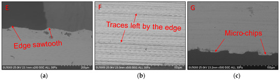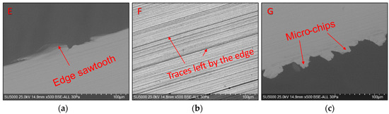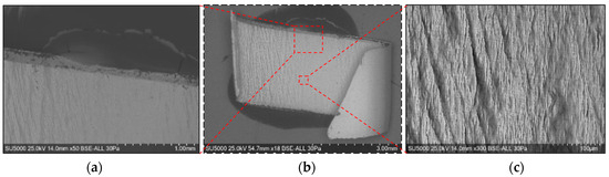 The chip formation process comprises a phase of plastic deformation, followed by a chip initiation and breakage phase, as described in various scientific papers [12,37,38,39]. Niu et al. [37] presented the general theories of chip formation, highlighting the fact that the model of shear planes (adiabatic shear theory) is suitable for processing materials with good plasticity. In contrast, the periodic brittle fracture theory model is suitable for processing more fragile materials. For hard machining processes, it is accepted that the chip formation model is that of the shear planes [38], and the microscopic shape of the detached chips has the appearance of some saw teeth. In the study by Zhang, S. and Guo, Y.B. [11] regarding the milling of steel with a hardness of 50HRC, it was concluded that the cutting speed and the feed per tooth are the most important parameters in the formation of chips. Their combination leads to the formation of different types of chips, from continuous chips to serrated chips. Furthermore, in connection with the milling of some hard steels, Cui, X. and Zhao, J. found that [7], for cutting speeds up to 400 m/min, the chips are formed as a series of saw teeth; however, with the increase in speed cutting that speeds up to 2000 m/min and even higher values, these chips segment and become interrupted.