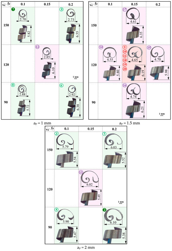 For all CCD experiments, the macroscopic dimensions of the chips were measured by optical microscopy using an OLYMPUS SZ61. The aim was to establish the relationship between the size of the chips and the cutting parameters. To achieve this, the response surface method and the ANOVA statistical analysis method were employed.