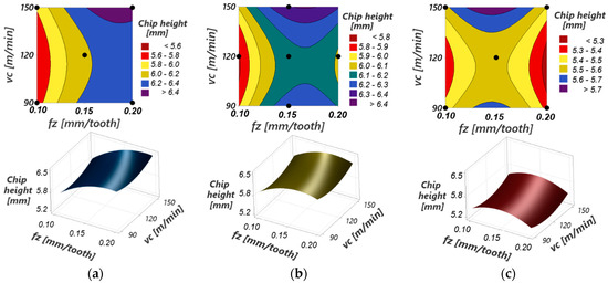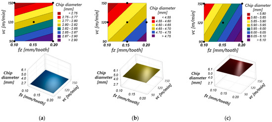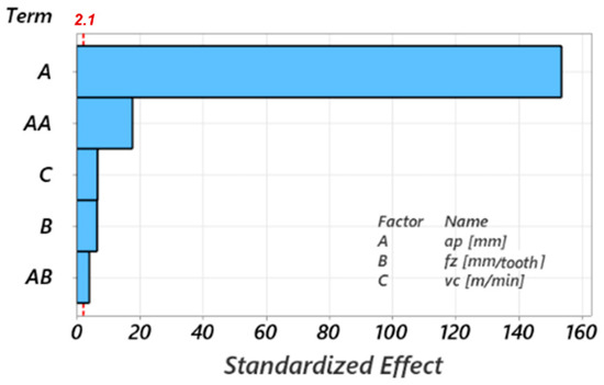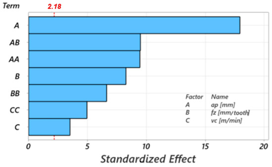Experimental-statistical methods are frequently used to establish the dependence of some results of the hard metal milling process on the cutting parameters, such as the forces and temperatures in the process [6,46,47]. In these studies, DOE or Taguchi [4,48] are used for planning the technical experiments, which allow for a statistical analysis of the results (ANOVA) and the presentation of the mentioned dependencies in the form of response surfaces (RSM) [49,50].