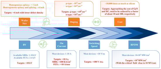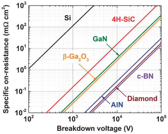 Power semiconductor devices are core components in electronic power systems used in almost all electronic manufacturing industries. Typical application areas include consumer electronics, mobile communications, electronic equipment, etc. [1]. The type of semiconductor has played a critical role in specific applications like power devices [2]. For example, Si is still the most widely used material in semiconductors and integrated circuits in the field, and more than ninety percent of the devices use silicon as a material. However, as the device size shrinks, the performance of Si gradually fails to meet the requirements of a variety of applications. This is due to its narrow bandgap (1.12 eV), lower breakdown field (~3 × 105 MV/cm) and saturation speed (~107 cm/s), and other defects, for example, the specific on-resistance of silicon-based power devices is proportional to the 2.5 power of the breakdown voltage, which constrains the improvement of the power figure of merit. All these defects limit its application in high-voltage, high-power occasions [3,4,5]. Some high-carrier-mobility semiconductors like indium phosphide (InP) and gallium arsenide (GaAs) have alternatively been used in high-performance microwave and millimeter-wave devices and light-emitting electronic devices [6]. Nevertheless, GaAs and InP still have problems such as high cost, material scarcity, and high toxicity, and their narrow bandgap (1.4 eV) makes them unsuitable in advanced power device applications.