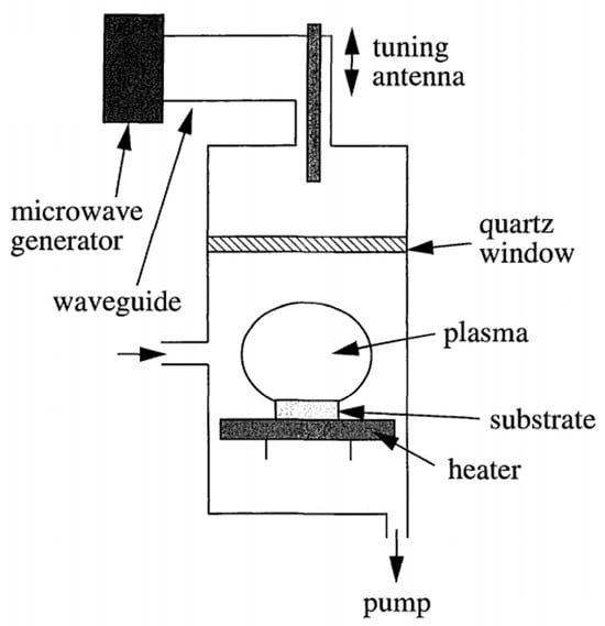 MPCVD is developed based on the CVD (chemical vapor deposition) technique, which is a versatile method for creating thin films by introducing gaseous precursors that undergo chemical reactions and physical changes on a substrate’s surface. MPCVD leverages this concept but utilizes microwave plasma to control the deposition process. This allows for precise control over factors like temperature, pressure, and the choice of precursor gas, ultimately leading to the formation of a diamond film on the substrate. In 1968, the Soviet scientists Derjaguin et al. [48] first used CVD to deposit diamond films on non-diamond substrates, but the speed was slow (only 250 μm/h). In 1983, the Japanese scientists M. Kamo et al. [44] successfully achieved the epitaxial growth of diamond films for the first time using the MPCVD method. Since then, MPCVD has become the mainstream method for preparing diamond films, and its equipment structure is shown in Figure 4 [49]. A mixture of methane and hydrogen is passed into the chamber. The plasma generated by the microwave power provides the activation energy for the decomposition of methane, and the carbon atoms obtained from the decomposition are deposited on the substrate surface. The etching rate of hydrogen on graphite is much higher than that of diamond, and the graphite is selectively etched away during the reaction process, ultimately leaving behind the diamond.