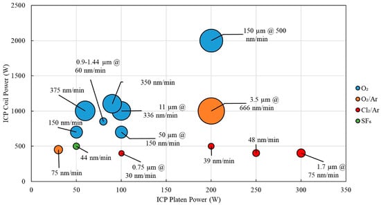 Etching rate versus ICP Coil/Platen power of the specified ICP-RIE process [60]. This figure gives the results of the etching rate of various gases as etching sources.