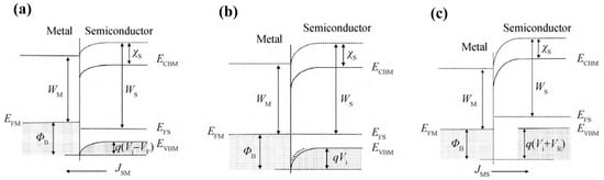 Formation of Schottky contact between metal and p-type semiconductor at (a) forward bias; (b) zero bias; and (c) reverse bias [102].