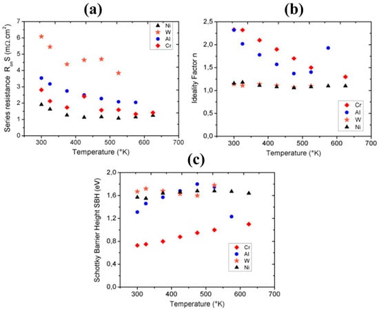 (a) Ron; (b) ideal factor; and (c) SBH for W, Al, Cr, and Ni at different temperatures [103].