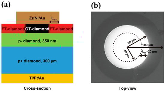 (a) Device schematic of the vertical diamond SBDs with FT structure. (b) Top-view SEM image of the SBDs [108].
