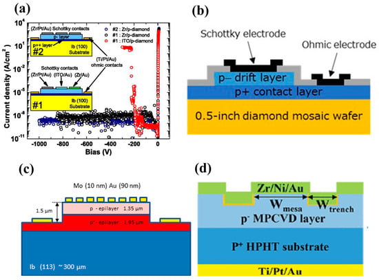 Device schematic of (a) pVSBDs with p+ doping concentration of 1020 cm−3 and p- doping concentration of 1015 cm−3 [106]; (b) pVSBDs using a half-inch diamond wafer [131]; (c) pVSBDs on (113)-oriented homogeneous epitaxial boron-doped diamond substrates [130]; and (d) trench MOS barrier Schottky diodes [77].