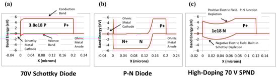 The conventional pn junction diode (PND) structure in diamond is shown in Figure 11d, which is limited by the deep donor level of phosphorus, high built-in voltage and on-resistance, and long reverse recovery time [143]. It is known that the SBD is a unipolar device with the advantages of low forward conduction voltage and fast switching speed. Kubovic et al. [144] introduced a Schottky contact based on PNDs. Schottky p-n diodes (SPNDs) inherit the low forward conduction voltage characteristics of SBD while leveraging the advantages of the low reverse leakage current and high breakdown voltage afforded by the PND. The energy-band structures of the three diodes are shown in Figure 14 [145], which visually reflects the characteristics of the devices, especially the lower Schottky barrier of the SBDs and the high bandgap that the PNDs need to cross when they are turned on.