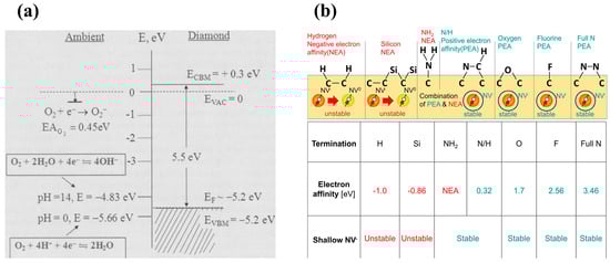 - Sque, S.J.; Jones, R.; Öberg, S.; Briddon, P.R. Transfer doping of diamond: The use of and to effect p-type surface conductivity. Phys. B Condens. Matter 2006, 376–377, 268–271. [Google Scholar] [CrossRef]